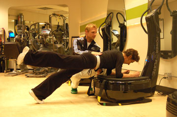 In a nutshell, the Power Plate is a unique tool to the mainstream in that it vibrates in three planes (side to side, up and down, back and forth) which causes muscles to contract involuntarily 25-50 times per second to stabilize while someone performs exercises upon it. This increases the force of gravity on the body 6 fold , much in the same way in which muscles are loaded with extra weight in resistance training; the exception is that with the Power Plate, the workout is low impact, which means there is less chance of injury and reduced wear and tear of the body. It helps improve blood circulation, strengthen bone mineral density, reduce recovery time for injuries, reduce cellulite, and aid in lymphatic drainage and detoxification. "You can get the same results from a twenty-five minute workout as you would in a fifty minute one," says Jordan. "Also, part of the attraction to it is just that it feels good."