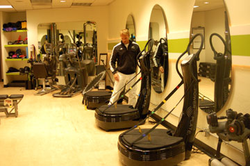 Jordan's plans for the future include creating a global brand via a web site where people can pay to download exercise programs for working on the Power Plate. He also has started organizing retreats to health spas, such as the one at the Sandos Caracol Eco Resort and Spa in Mexico from June 26 th - July 2nd. Using what he calls "the three pillars of success: motivation, inspiration, and education," Jordan offers one on one and semi-private (2 or 3) training, and massage therapy utilizing a vibrating bed and a percussive instrument called the deep muscle stimulator in an effort to "bridge the gap between physical therapy and fitness." Jordan also offers the Posture Perfect Program, which helps clients correct the misalignment of rounded shoulders and sway back, for example.