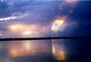 Toting our heavy ruck-sacks, we walked through the village: huts without walls raised on weathered planks so as to protect themselves from the delugeable Ucayali River, a telephone box, an ancient well that was the villages only water supply, skinny chickens pecking at kernels of uncooked corn (choclo), streams of black ants marching up into the jungle canopy, clouds of pernicious mosquitoes, lizards scampering about to camouflage themselves from prey and their nightmarish predators, and countless trees and plants harboring pucay, cocoa, platanos (bananas), papaya, and more earthly delights. |